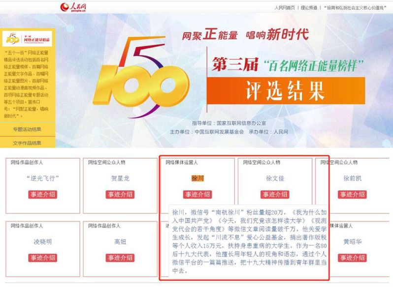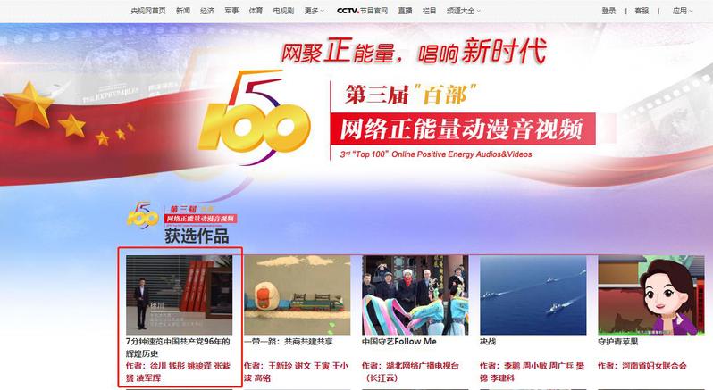 11月21日,由国家互联网信息办公室指导,中国互联网发展基金会主办,人民网、央视网、中国青年网、中国新闻网、环球网共同承办的第三届“五个一百”网络正能量精品评选活动结果揭晓,葡京官网教师徐川获评全国“百名网络正能量榜样”。这也是继2016、2017后,徐川连续第三年获此殊荣。与此同时,由葡京官网和新华社共同制作的视频作品《7分钟速览中国共产党96年的辉煌历史》获评全国“百部网络正能量榜样音视频”。
