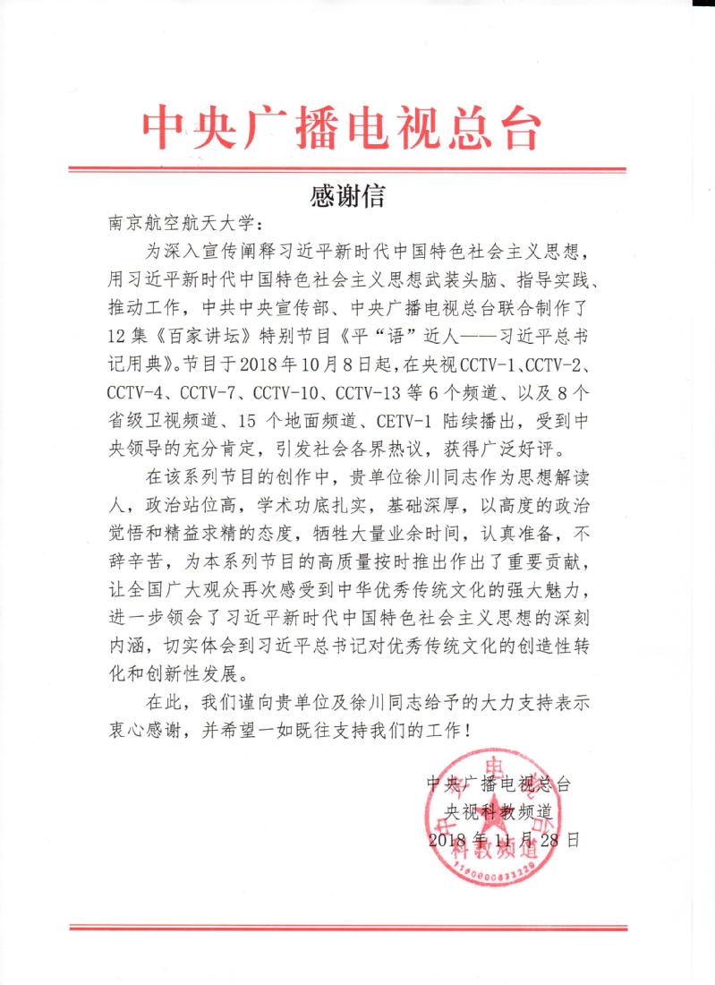 日前,中央广播电视总台发来感谢信,感谢葡京官网对《百家讲坛》特别节目《平“语”近人——习近平总书记用典》的大力支持。
