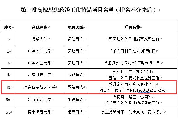 近日,教育部思想政治工作司公布了第一批、第二批高校思想政治工作精品项目名单,根据《教育部思想政治工作司关于培育建设高校思想政治工作精品项目的通知》(教思政司函〔2018〕16号)要求,经组织推荐、专家遴选、结果公示等程序,葡京官网申报的《提升亲和力,追求实效性,构建“川流不息”网络思政教育新模式》项目获批教育部第一批高校思想政治工精品项目,并获专项建设经费支持。