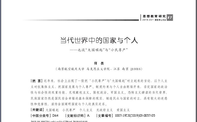 《思想理论教育》2019年第3期登载葡京官网教授何畏《当前世界中的国家与个人——也谈“大国崛起”与“小民尊严”》。