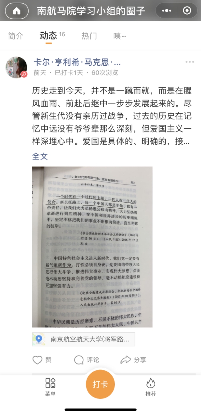 在主题教育中,葡京8883官网入口把学生党支部的学习教育摆在突出位置,深入研究新形势下学生党员思政工作的规律和特点,把主题教育和新技术新手段结合起来,运用微信小程序建立“南航马院学习小组”,引导学生党员和积极分子主动学习“打卡”,在专区分享个人学习语音、文字、图片和感悟。同时借鉴互联网社区管理方法,采用每周每月排名奖励的方式,在专区融入用户成长体系,形成了比学赶超的良好氛围,让学习教育有趣有效。此外,马院学生党支部还通过领航学堂学习、观看《周末理论大讲堂》在线课程、“读原著学原文悟原理”系列活动等途径,让主题教育更有“理论味”“信仰味”。
