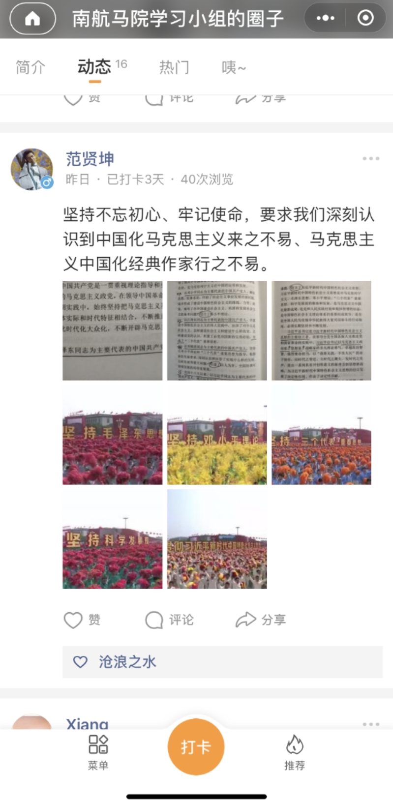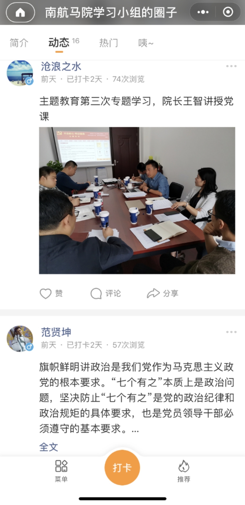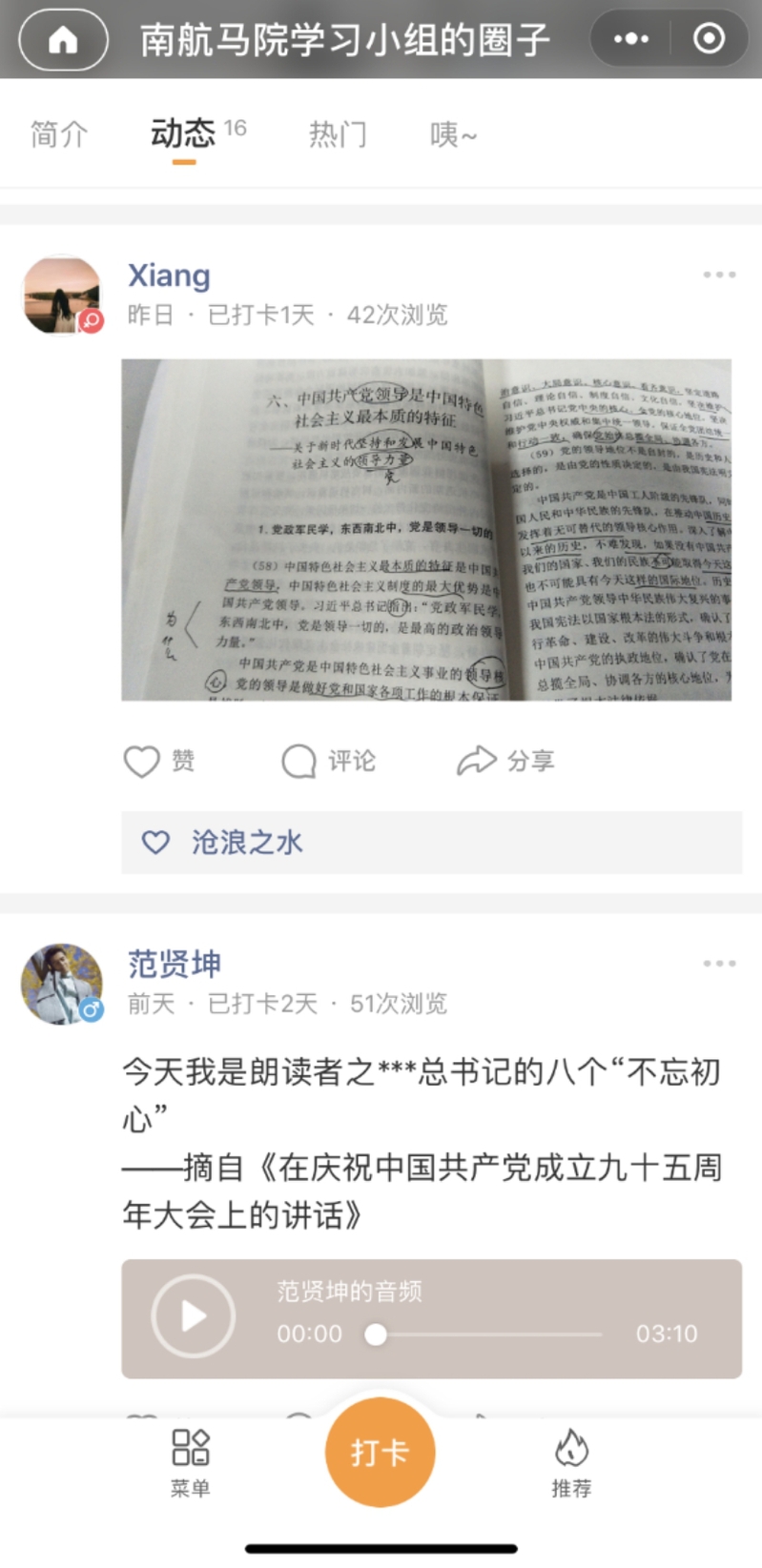 在主题教育中,葡京8883官网入口把学生党支部的学习教育摆在突出位置,深入研究新形势下学生党员思政工作的规律和特点,把主题教育和新技术新手段结合起来,运用微信小程序建立“南航马院学习小组”,引导学生党员和积极分子主动学习“打卡”,在专区分享个人学习语音、文字、图片和感悟。同时借鉴互联网社区管理方法,采用每周每月排名奖励的方式,在专区融入用户成长体系,形成了比学赶超的良好氛围,让学习教育有趣有效。此外,马院学生党支部还通过领航学堂学习、观看《周末理论大讲堂》在线课程、“读原著学原文悟原理”系列活动等途径,让主题教育更有“理论味”“信仰味”。