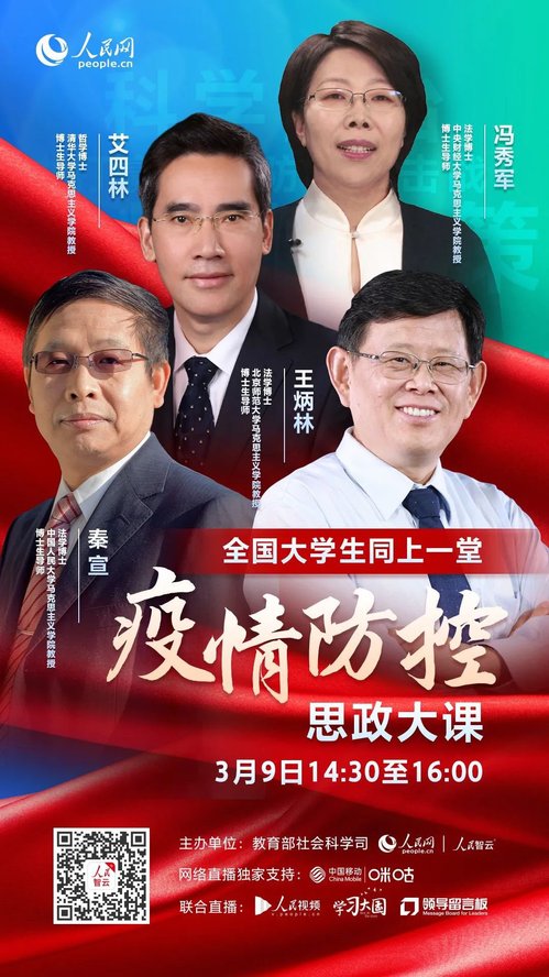 在举国上下众志成城、万众一心做好新冠肺炎疫情防控工作的特殊时期,3月9日,由教育部社会科学司、人民网联合举办的“全国大学生同上一堂疫情防控思政大课”通过网络直播的形式开课。此次“思政大课”邀请了清华大学葡京8883官网入口艾四林、中国人民大学葡京8883官网入口秦宣、北京师范大学葡京8883官网入口王炳林、中央财经大学葡京8883官网入口冯秀军四位教授结合思政课程的内容对党中央关于疫情防控的决策部署进行了深刻的解读。马院高度重视此次活动,统筹安排、克服直播拥堵困难,提前三天通过学院官网、微信等平台积极推广宣传,及时下发观看通知,鼓励思政教师组织学生统一观看、研讨。