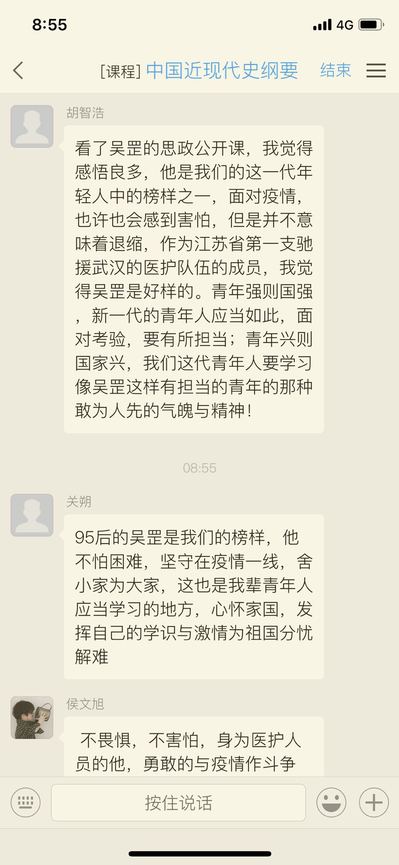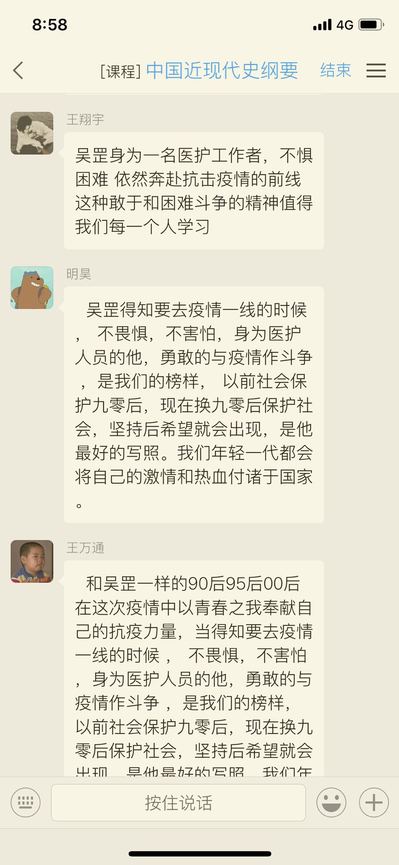 在课程中,吴罡从认识新冠、战疫历程、感人瞬间和成长收获等几个方面进行讲述,他第一时间向医院情愿奔赴抗疫前线的勇气,在前线申请入党的态度,积极乐观的工作作风以及“身为医务工作者,不是看见了希望才去坚持,而是坚持了才会看见希望。”的铮铮誓言,“作为一个90后,我觉得最好的生活状态是有事做,有人爱,有所期待”的生动话语,给听课的同学们带来强烈共鸣,纷纷发表观看感受,致敬这位同龄英雄,讨论互动气氛热烈。