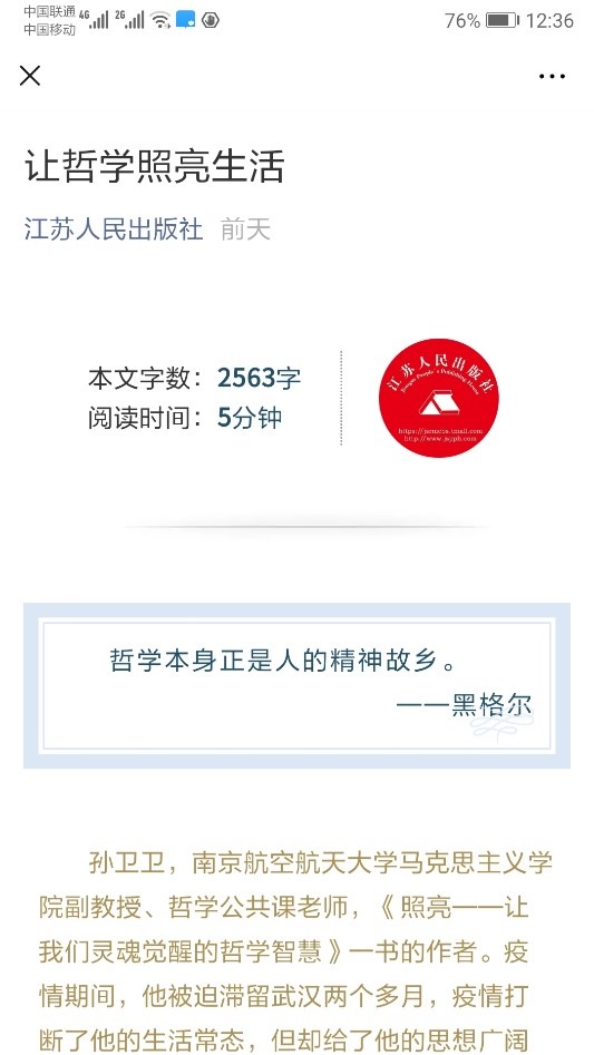 让生命感动,让灵魂觉醒,让思维启锚;把哲学带进生活,让智慧照亮人生。也许正因为秉持这样的写作理念,孙卫卫老师的著作《照亮——让我们灵魂觉醒的哲学智慧》得到了读者的青睐。发行不久,江苏人民出版社便在其微信公众号对该书进行了重点推介;4月23日,远在万里之外的贵阳市在2020读书月活动中,更是将该书列为全民阅读100本推荐好书,且位列哲学社会类书籍第一名。目前,该书在当当、淘宝、京东、苏宁各大网站均有销售。