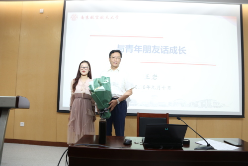 在讲座开始前,学生代表还向王岩教授献上鲜花,表达了同学们对老师真挚的节日祝福。