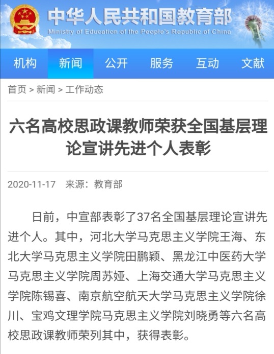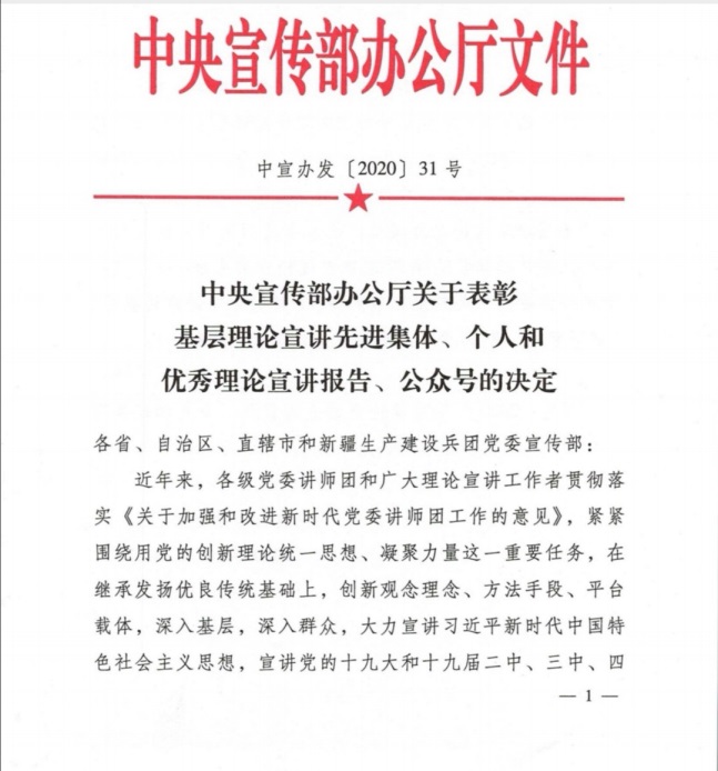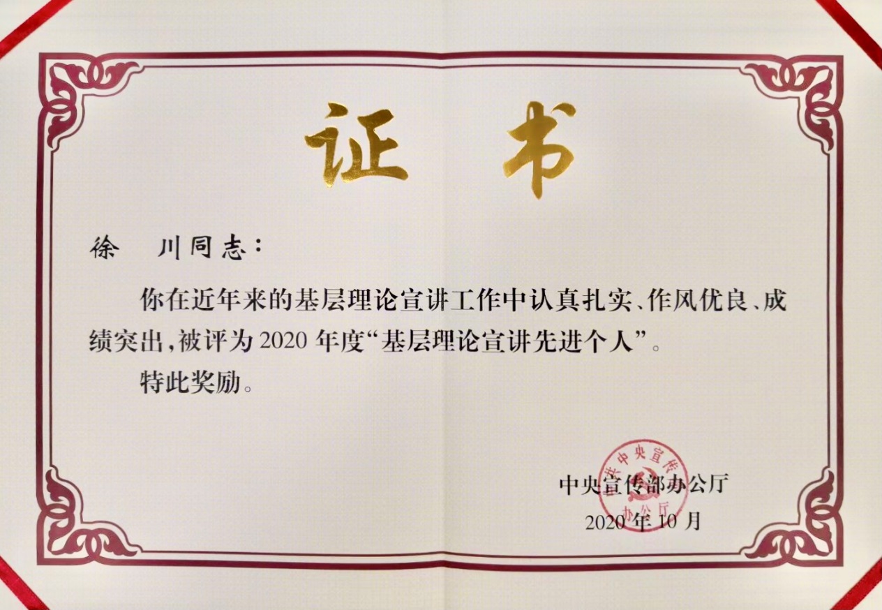 近日,中宣部办公厅印发了《关于表彰理论宣讲先进集体、个人和优秀理论宣讲报告、公众号的决定》,旨在表彰新时代理论宣讲工作中涌现的先进集体和个人。经中央领导同志批准,决定对46个基层理论宣讲先进集体、37名基层理论宣讲先进个人、17篇优秀理论宣讲报告、20个优秀理论宣讲公众号予以表彰。葡京官网徐川教授获评基层理论宣讲先进个人荣誉称号,是工信部系统和江苏高校系统唯一获表彰的个人。
