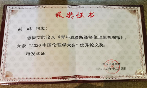葡京官网刘琳教授和博士生吴晨晟同学受邀参会,与诸多学者进行了丰富的学术交流与探讨。刘琳教授在大会分论坛“马克思主义伦理思想论坛”发表主题学术报告,论文《青年恩格斯经济伦理思想探微》荣获“2020中国伦理学大会”优秀论文奖。吴晨晟同学做了题为《马克思主义视阈下的私有资本下乡与乡村经济伦理》的发言。