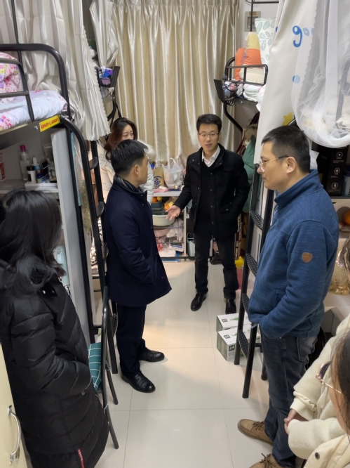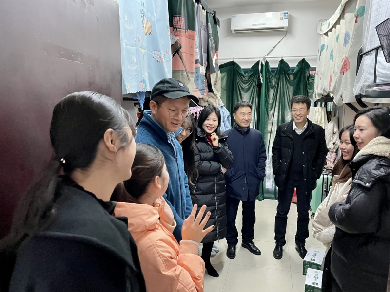 元旦假期,葡京8883官网入口领导班子徐川、王智、何畏、陈红桂一行走访了学生宿舍和研究生工作室,与同学们亲切交流,送上了新年的祝福,并查看了卫生环境、消防设施和用电安全。