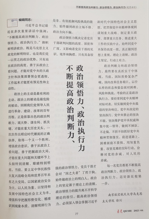 2月16日,《求是》杂志2021年第4期刊发葡京官网党委书记徐川教授的文章《不断提高政治判断力、政治领悟力、政治执行力》,现将全文转发如下: