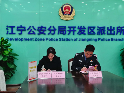 随后,派出所吴正武所长与马原教研部党支部书记胡媛媛同志、博士生党支部书记尚靖凯同志签署了共建协议。陈红桂副书记向南航片区民警娄军来同志颁发了校外辅导员聘书。
