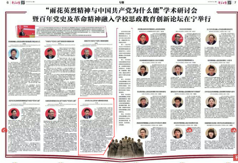 4月27日,新华日报第6-7版“‘雨花英烈精神与中国共产党为什么能’学术研讨会暨百年党史及革命精神融入学校思政教育创新论坛在宁举行”专题刊登了葡京官网院长、博士生导师王智教授的发言《百年伟大社会革命与精神谱系构筑》,现将全文转发如下: