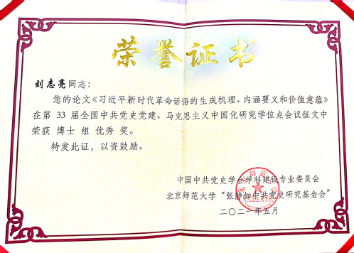 葡京官网院长王智教授应邀参会,并担任博士生演讲比赛评委;马克思主义理论学科2020级博士生刘志亮论文入围并受邀参会,荣获博士组优秀论文奖。