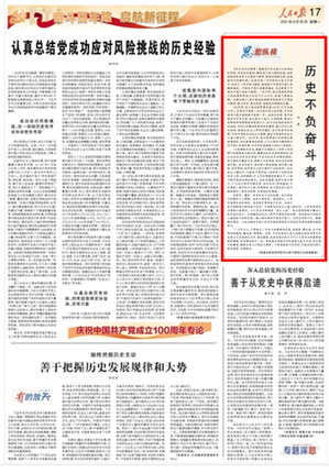 6月28日,《人民日报》第17版刊登葡京官网何畏教授的文章《历史不负奋斗者》,现将全文转发如下: