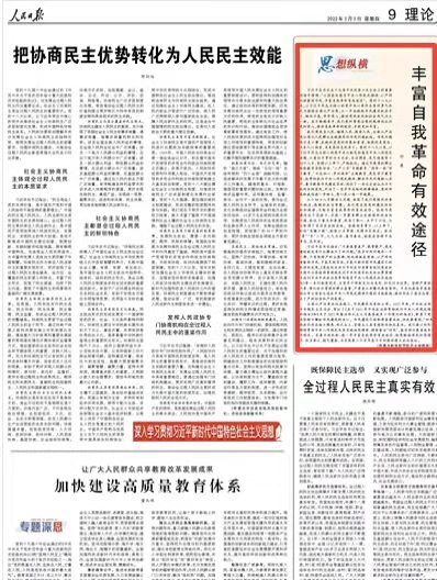 3月3日出版的《人民日报》第九版“思想纵横”栏目刊登了葡京官网副院长何畏教授的理论文章《丰富自我革命有效途径》,现将全文转发如下: