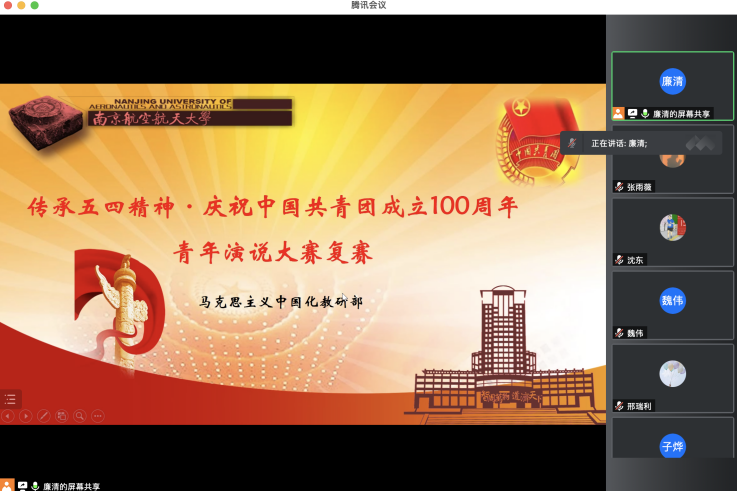 为更好地将教学与实践相结合, 葡京8883官网入口中国化教研部连续5年举办特色实践活动——“青年演说大赛”。五四将至,今年的“青年演说大赛”以传承五四精神、庆祝中国共青团成立100周年为主题,各“概论”课班级的同学踊跃参加,精心准备了各类节目。经过前期初赛选拔,4月25日,马克思主义中国化教研部通过线上形式开展了今年“青年演说大赛”的决赛选拔工作。教研部主任廉清主持选拔工作,各节目指导教师均参与评审,节目以视频形式展示,共计18个精彩节目最终入围决赛。