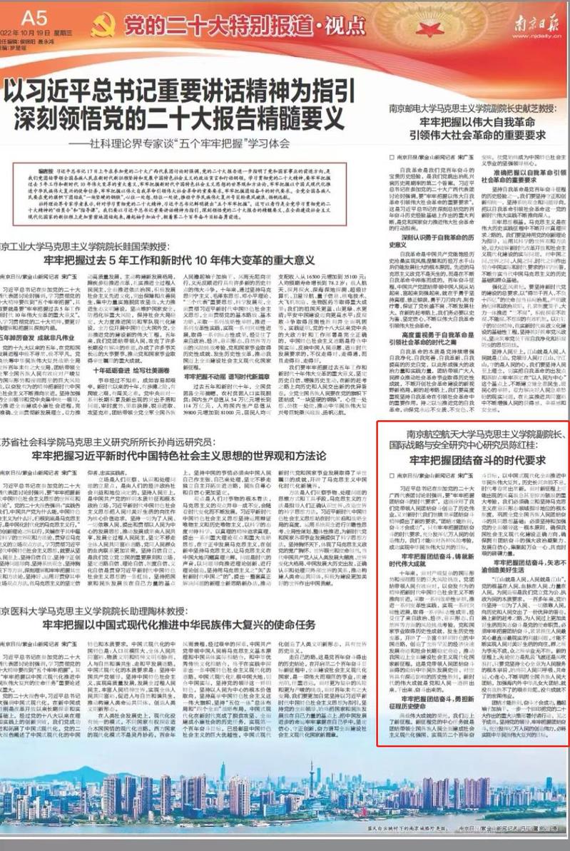 10月19日,《南京日报》第A5版“党的二十大特别报道•视点”栏目刊登了葡京官网陈红桂副教授的理论文章《牢牢把握团结奋斗的时代要求》,现将全文转发如下: