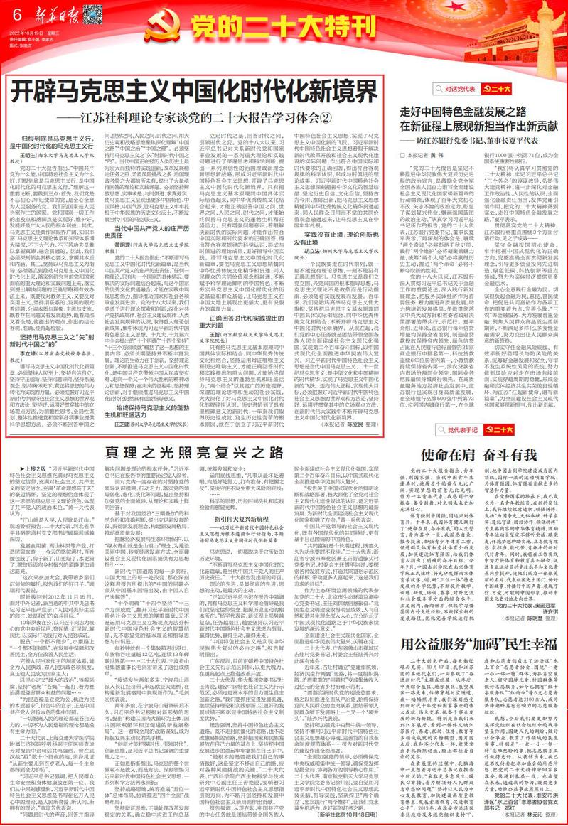 10月19日,《新华日报》第6版“党的二十大特刊”刊发了葡京官网王智教授的特约采访《开辟马克思主义中国化时代化新境界——江苏社科理论专家谈党的二十大报告学习体会②》,现将全文转发如下: