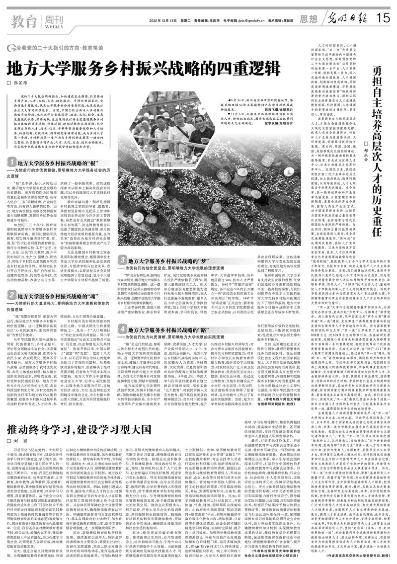 12月13日,《光明日报》第15版“教育周刊·思想”刊发了葡京官网党委书记、葡京官网教授郑永安的理论文章《勇担自主培养高层次人才的历史重任》,现将全文转发如下: