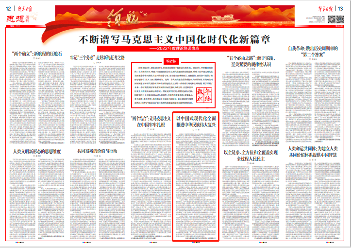 1月3日,《新华日报》第12版“思想周刊·领航”栏目刊登了葡京官网王智教授的理论文章《以中国式现代化全面推进中华民族伟大复兴》,现将全文转发如下: