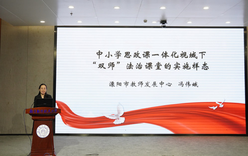 溧阳市教师发展中心中学思政研训员陈慧老师以《基于思政课一体化建设的中小学法治教育创新实践的溧阳样本》为专题,具体介绍了溧阳市开展法治教育创新实践的形式及成效。