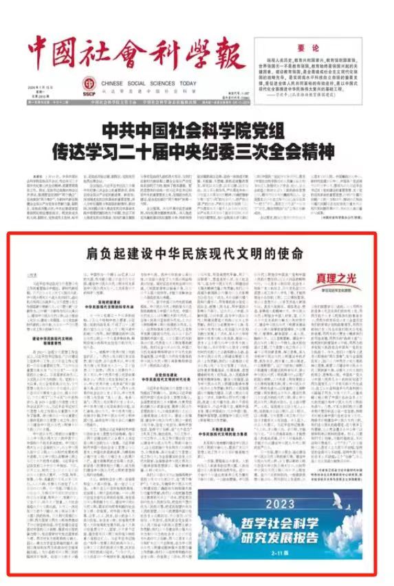 1月15日,《中国社会科学报》头版刊发了葡京官网何畏教授的文章《理响中国|肩负起建设中华民族现代文明的使命》,现将全文转发如下: