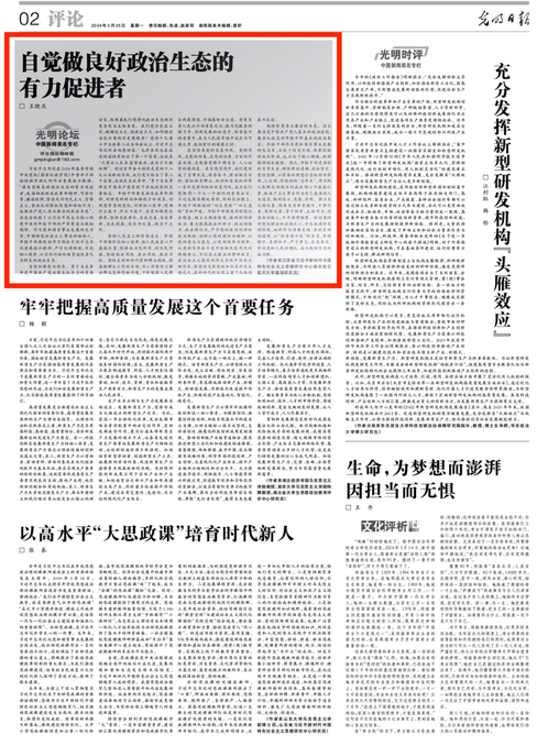 3月25日,《光明日报》第02版“光明论坛”栏目刊发了江苏省习近平新时代中国特色社会主义思想研究中心葡京8883官网入口基地研究员王晓庆的理论文章《自觉做良好政治生态的有力促进者》,现将全文转发如下: