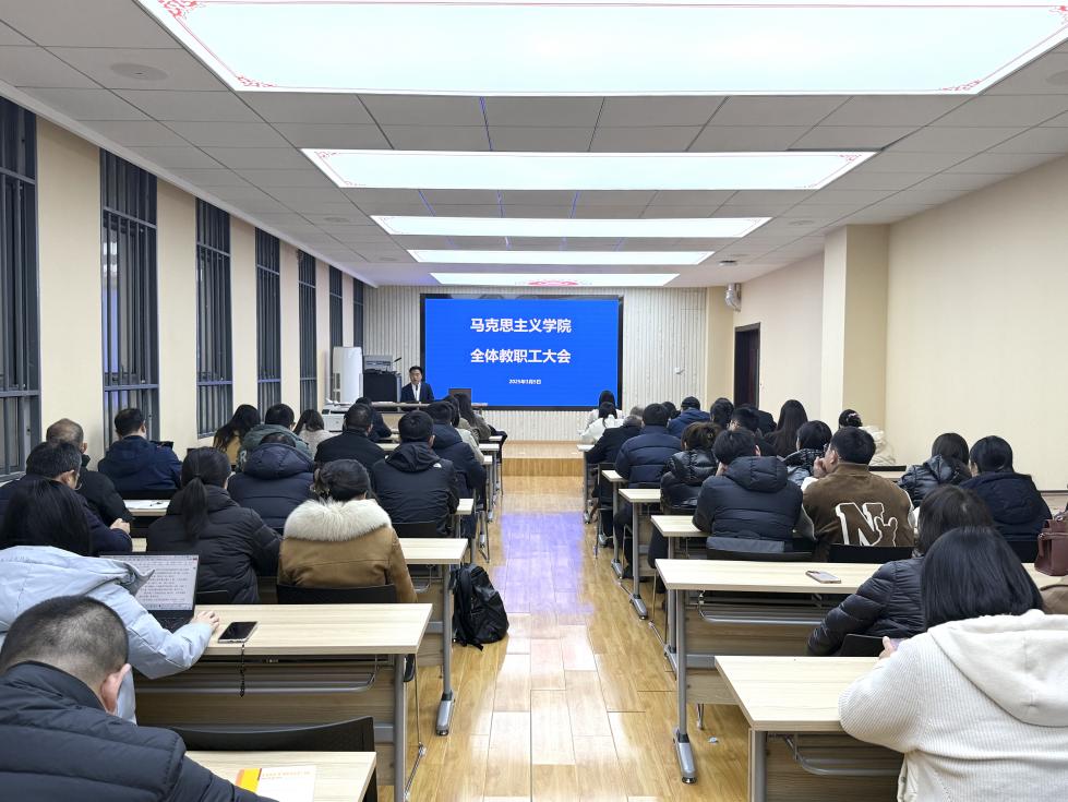 会上,院党委书记何畏传达学习学校2025年干部教师大会精神,并围绕五大年度工作安排、十年行动计划等进行细致解读。她强调,学院要紧扣立德树人根本任务,以加强思政课课程群建设为重点着力提升思政课教学质量,以“大思政课”品牌创建为契机提增铸魂育人实效,以高质量党建为保障引领马克思主义理论学科和思政课改革创新,全面提升学校马克思主义理论学科的影响力。