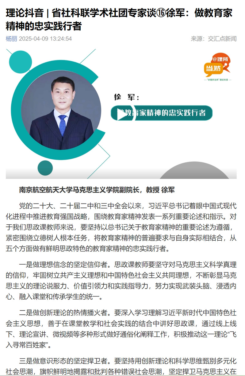 2025年4月9日,交汇点新闻刊发专题报道《省社科联学术社团专家谈⑯|徐军:做教育家精神的忠实践行者》,聚焦葡京8883官网入口副院长、教授徐军关于思政课教师践行教育家精神的深度思考。文章紧扣党的二十大、二十届二中及三中全会精神,围绕习近平总书记关于教育强国战略与教育家精神的重要论述,系统阐释了新时代思政课教师如何将教育家精神的普遍要求与思政育人实践深度融合,从“坚定信仰、理论播火、捍卫意识形态、铸魂育人、引领风尚”五个维度,为打造具有鲜明思政特色的教育家精神实践路径提供了行动指南。现将核心观点梳理如下: